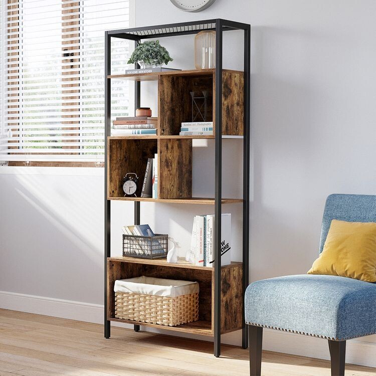 Bücherregal, Lagerregal mit Stahlgestell, für Dekoartikel, Bilderrahmen, Indutrie-Design, vintagebraun-schwarz
