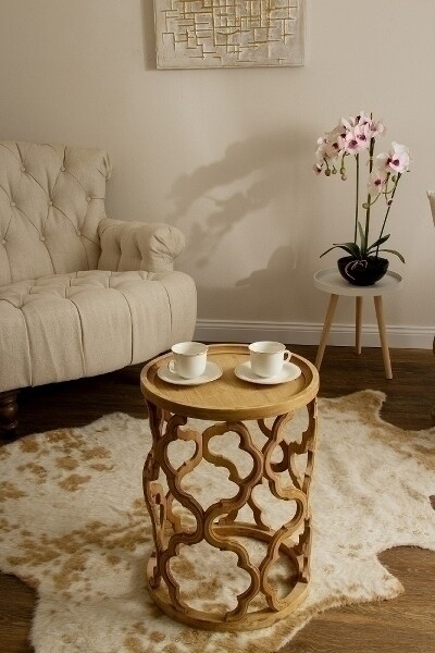 Dieser aussergewöhnlich designte Beistelltisch bietet durch eine Kombination aus geschwungenem Holz in der Unterkonstruktion sowie einer praktischen Ablagefläche mit leicht erhöhtem Rand einen Blickfang in jedem Raum.